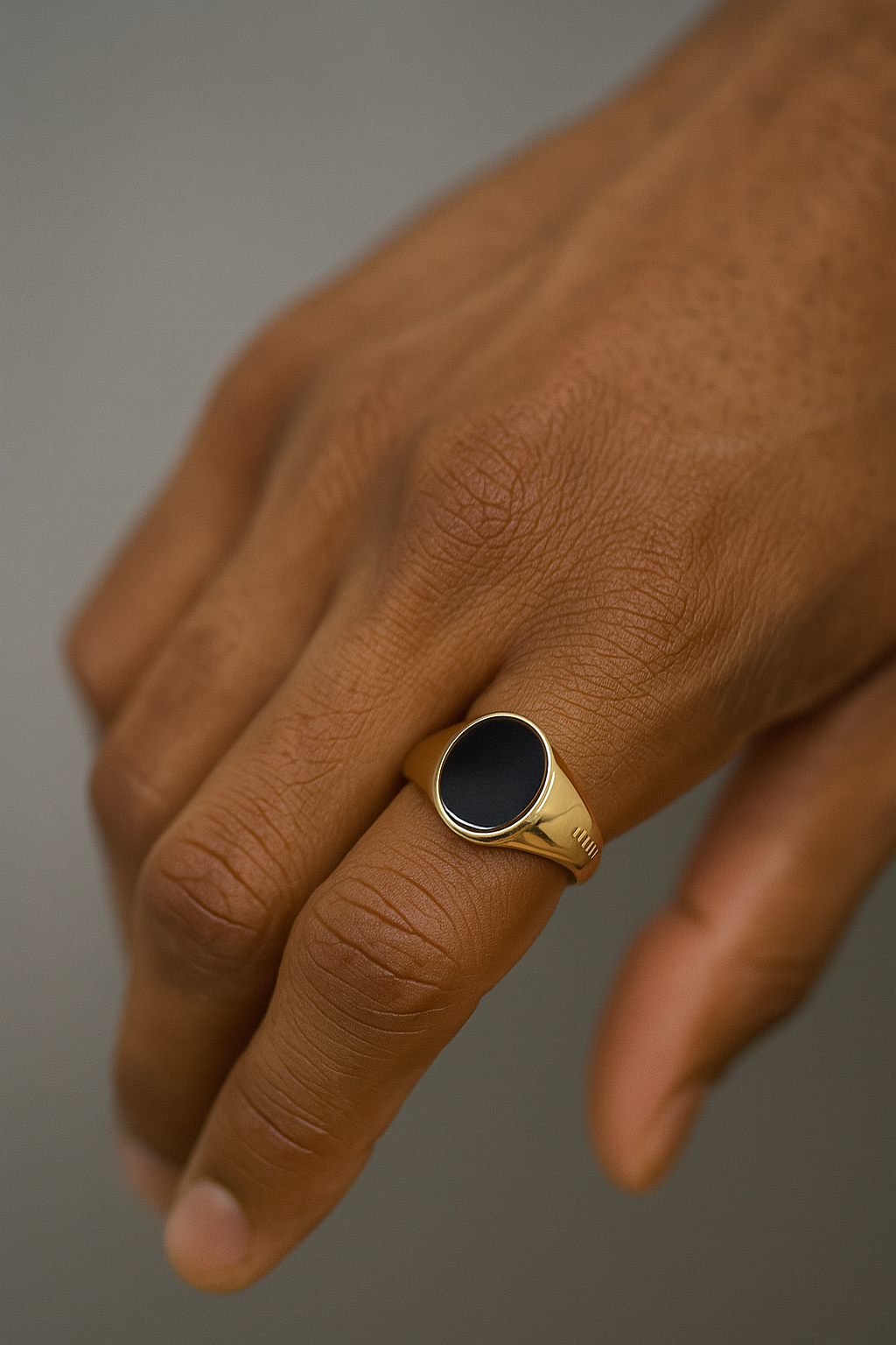 The Black Comfort Gold Ring features a smooth matte black center wrapped in a polished gold-tone frame. Comfortable yet bold, it’s made for the man who balances confidence with quiet power.